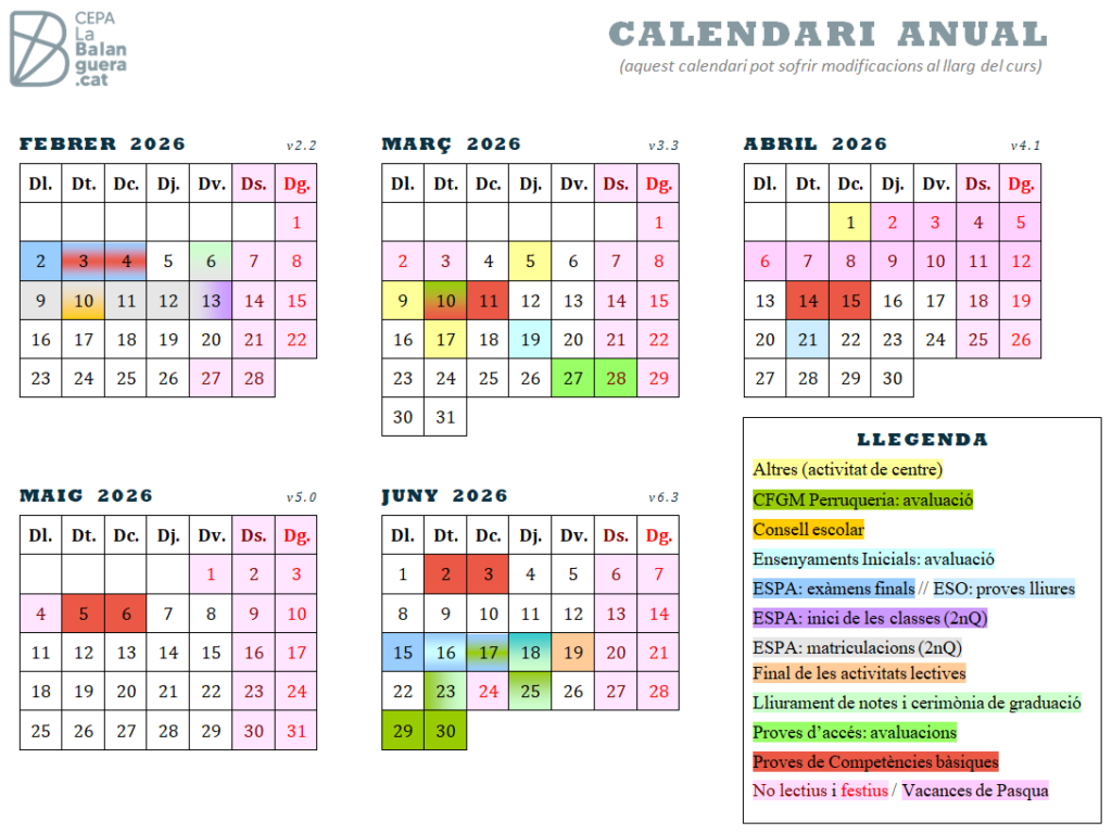 — Setmana 9 – 13: matriculació de l’alumnat d’ESPA per al 2n quadrimestre (més informació aquí).